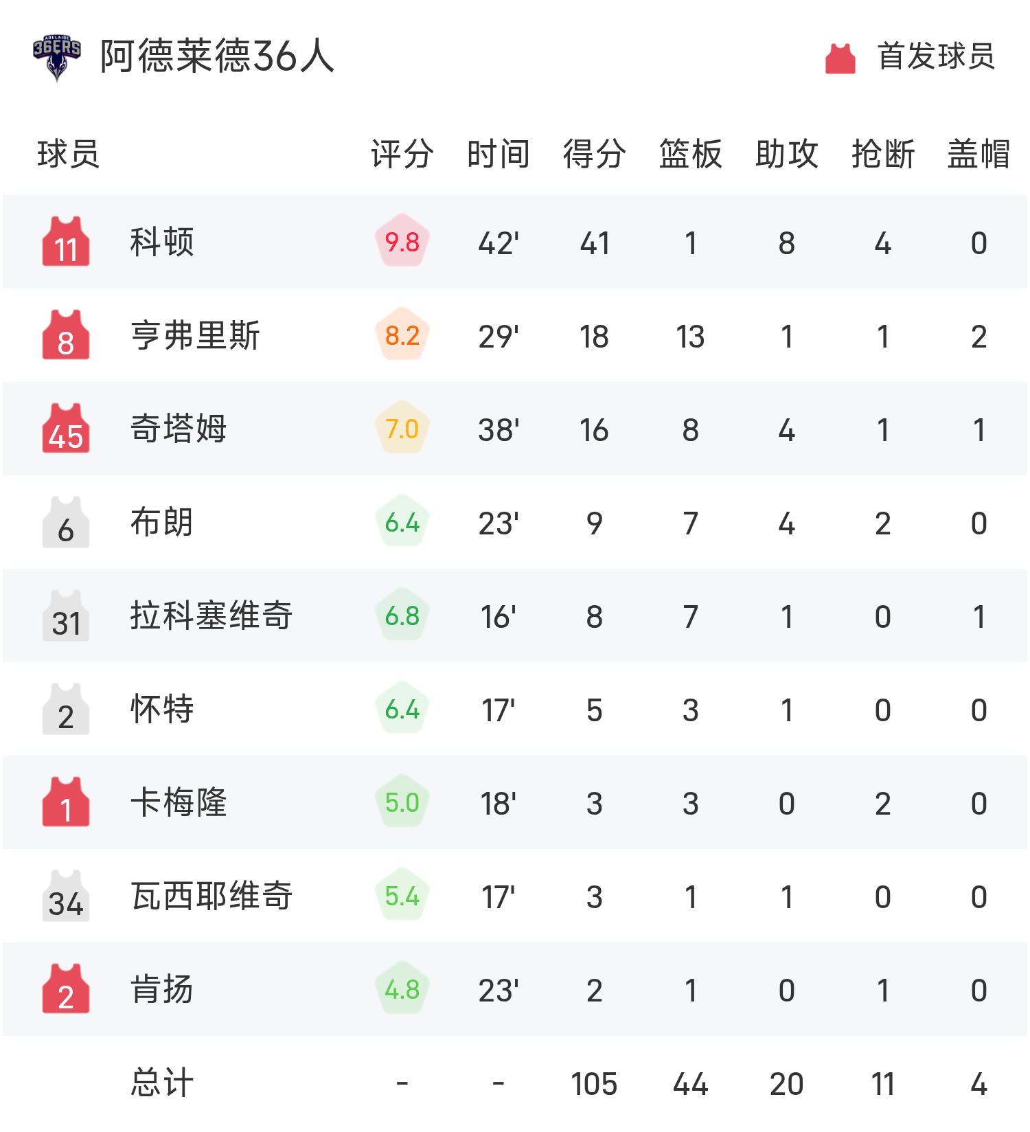 คอตเทนทำคะแนนสูงสุดในเกม 41 แต้ม 1 รีบาวด์ และ 8 แอสซิสต์ นำ 36 แอดิเลดไปสู่ชัยชนะ