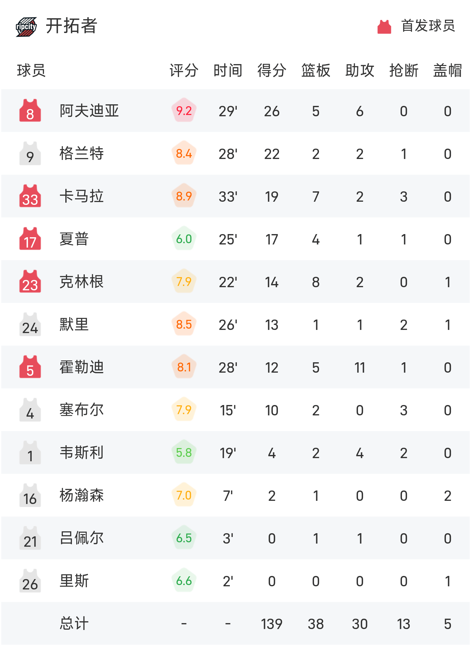 6686 กีฬา ข่าว 25 ตุลาคม ในฤดูกาลปกติของ NBA 25/26 ทีม Trail Blazers เผชิญหน้ากับ Warriors จบเกม เทรลเบลเซอร์ส เอาชนะ วอร์ริเออร์ส 139-119 อาฟดิจา 26 แต้ม 5 รีบาวด์ 6 แอสซิสต์ พาทีมคว้าชัย เคอร์รีทำคะแนนสูงสุดในเกม 35 แต้ม 6 รีบาวน์และ 3 แอสซิสต์