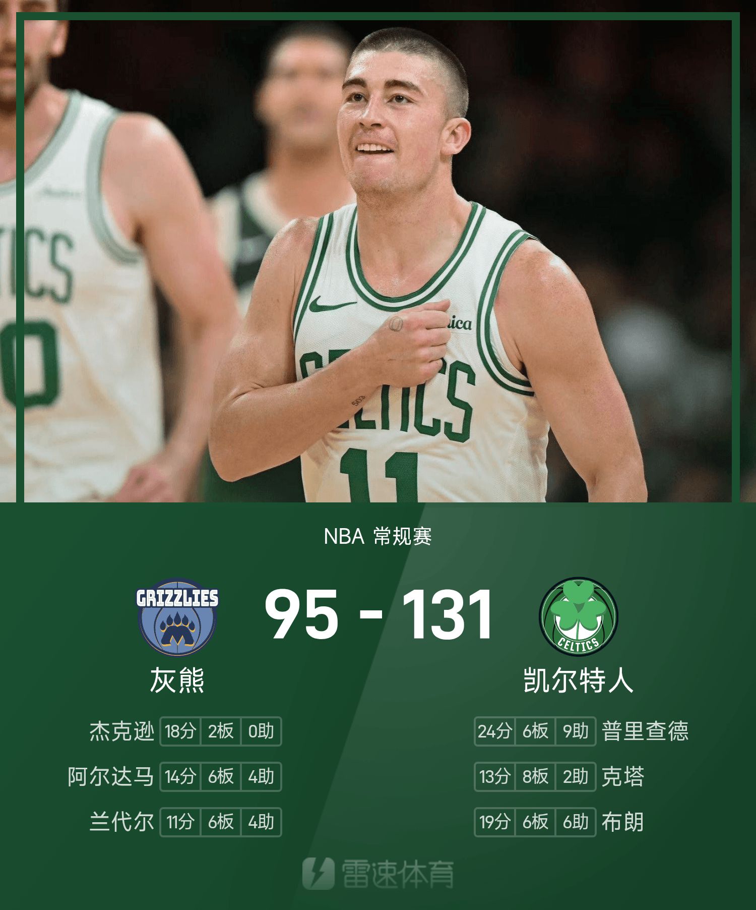 รายงานเกม NBA พริตชาร์ดมี 24 แต้ม 6 รีบาวด์ 9 แอสซิสต์ เซลติกส์เอาชนะกริซลี่ส์ 131-95