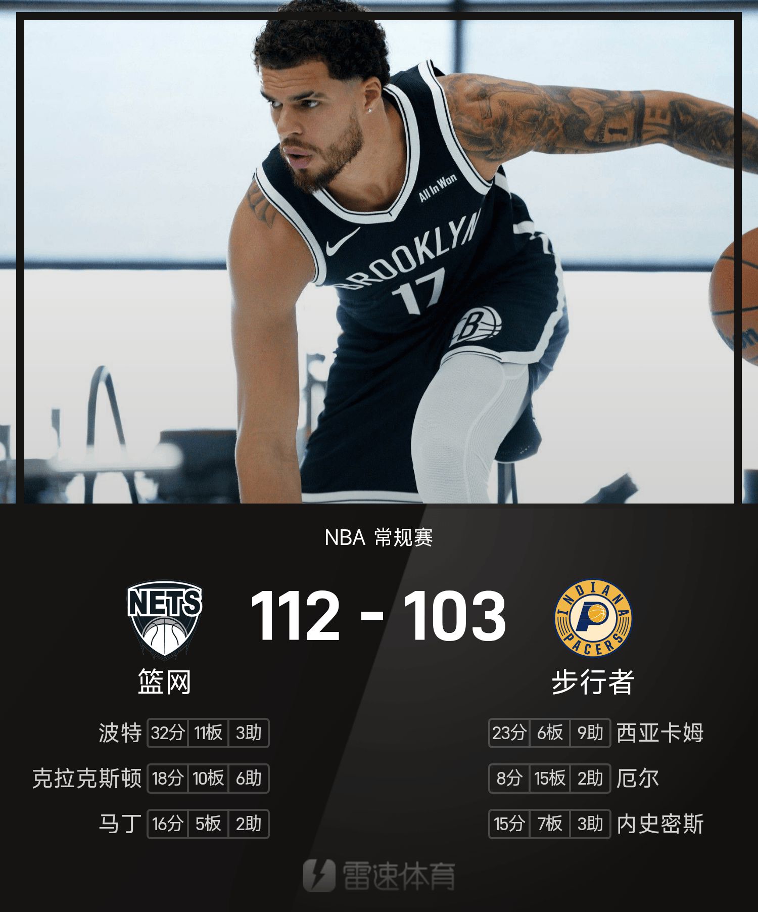 6686 กีฬา ข่าว 06 พฤศจิกายน ในฤดูกาลปกติของ NBA 25/26 Pacers เผชิญหน้ากับ Nets จบเกม Pacers แพ้ Nets 103-112 พอร์เตอร์ทำคะแนนสูงสุดในเกม 32 แต้ม 10 รีบาวน์และ 2 แอสซิสต์ นำตาข่ายไปสู่ชัยชนะ