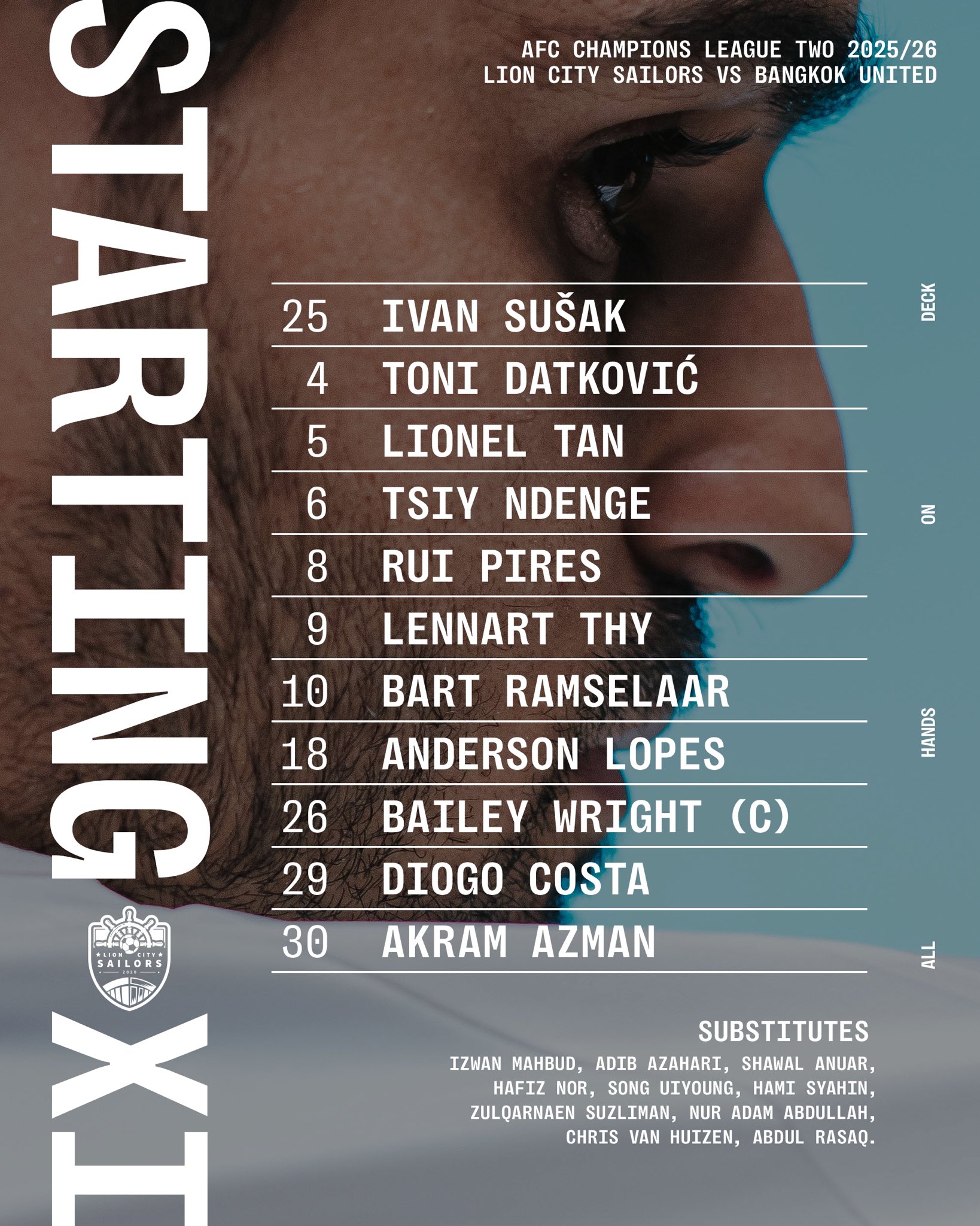 รายชื่อผู้เล่นตัวจริงของ Lion City Mariners:25-Susak, 26-Wright, 4-Datkovic, 5-Chen Hanwei, 29-Costa, 9-Tee, 10-Ramcelal, 6-เอ็นเดนเงอร์, 8-ปิแรส, 30-อัซมาน, 18-โลเปซ