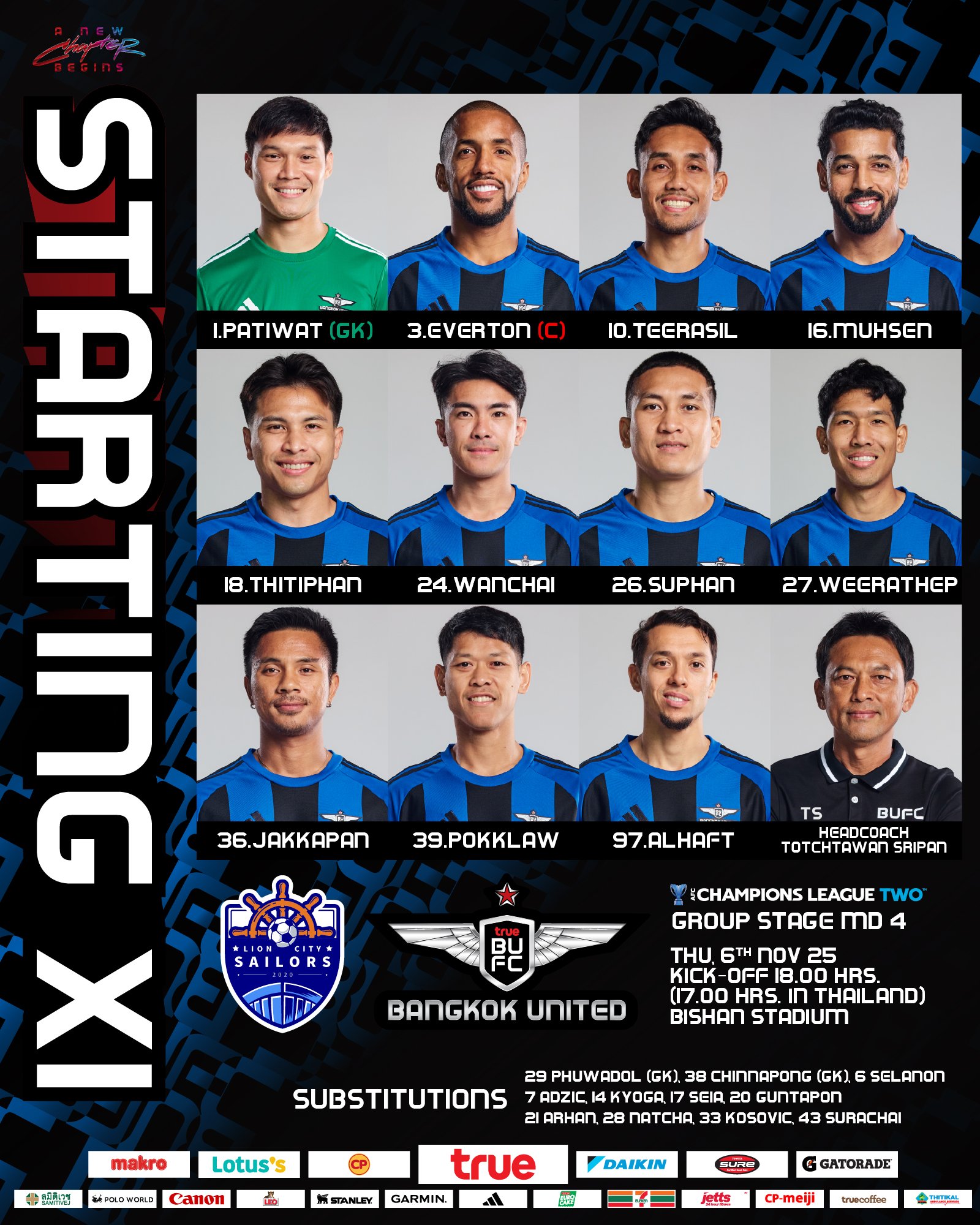 เวลา 18:00 น. ของวันที่ 6 พฤศจิกายน ตามเวลาปักกิ่ง ในรอบที่สี่ของ AFC Champions League รอบแบ่งกลุ่มที่สอง ทีมเหย้าของ Lion City Mariners จะเผชิญหน้ากับบางกอกยูไนเต็ด รายชื่อผู้เล่นตัวจริงได้รับการประกาศก่อนเกม
