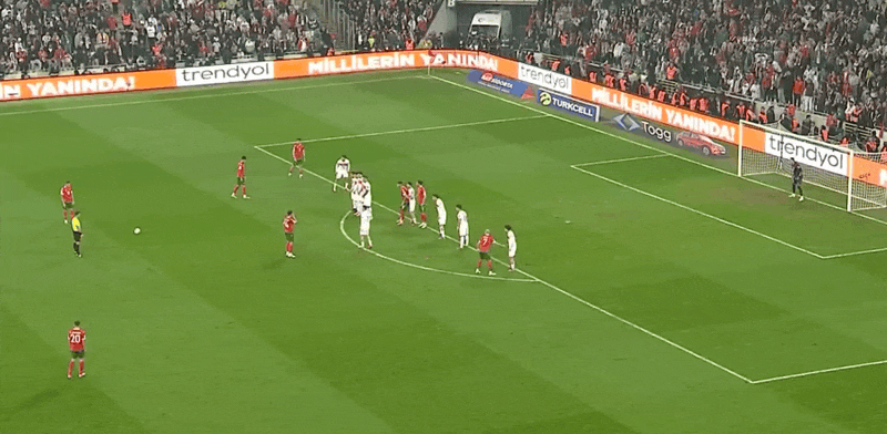 รายชื่อผู้เล่นตัวจริงของตุรกี: 23-Cakir, 14-Badak, 3-Demiral, 20-Kadioglu, 2-Celik, 10-Calhanoglu, 19-Edin, 16-Yuksek, 8-Gulay Er, 11-ยิลดิซ, 7-อัคตูโคกลู