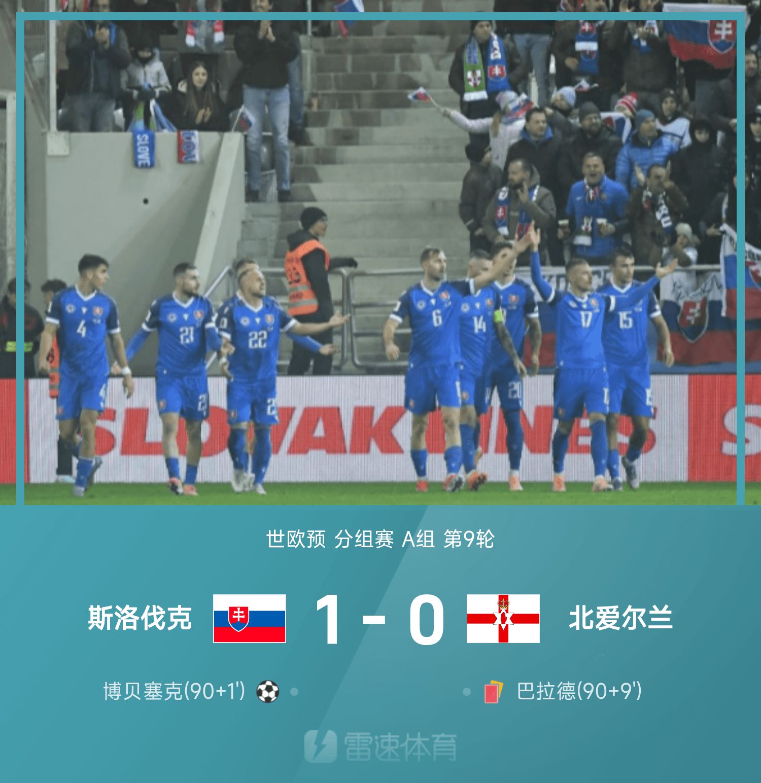 6686 ข่าวกีฬาวันที่ 15 พฤศจิกายน ในรอบที่ 9 ของกลุ่ม A ของรอบคัดเลือกโลกยุโรปครั้งที่ 26 เจ้าบ้านสโลวักเอาชนะไอร์แลนด์เหนือ 1-0 ครึ่งหลังของเกม สโลวาเกีย 2 ประตูไม่ได้รับอนุญาต ในช่วงทดเวลาบาดเจ็บ Bobesek ยิงประตูสุดท้าย จากนั้นบัลลาร์ดก็ถูกไล่ออก ปล่อยให้ไอร์แลนด์เหนือเหลือผู้เล่นเพียง 10 คนที่จะท้าทาย เยอรมนีและสโลวาเกียต่างทำคะแนนได้ 12 แต้มโดยชนะ 4 แพ้ 1 ทั้งสองทีมจะเผชิญหน้ากันโดยตรงในรอบสุดท้ายเพื่อแข่งขันเพื่อชิงตำแหน่งโดยตรงในรอบชิงชนะเลิศฟุตบอลโลก