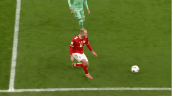 59' ฮอยเบลผ่านเขตโทษ และเวสเตอร์การ์ดส่ายหัวในพื้นที่เล็กๆ สามวินาที และยิงประตูให้สูง