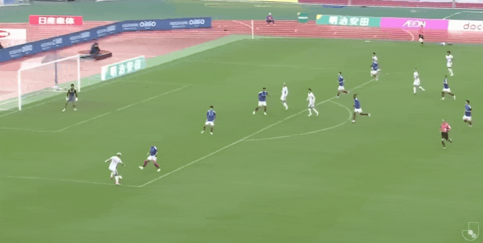 2' ไดกิ ซูกะ ส่งบอลไปทางเขตสามวินาที และ โช ซาซากิ โหม่งบอลให้กว้าง