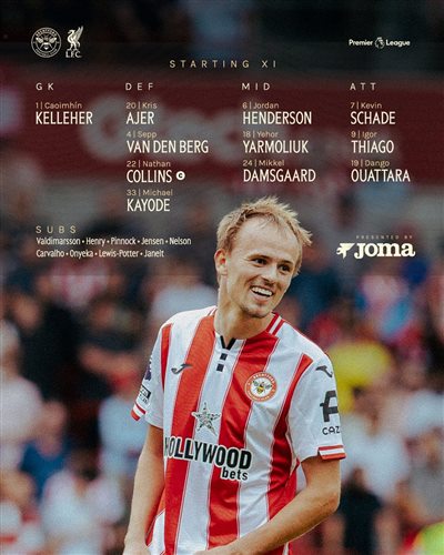 เบรนท์ฟอร์ดรายชื่อตัวจริง:1-เคลเลเฮอร์, 20-อาเยอร์, 4-ฟาน เดน เบิร์ก 22-คอลลินส์, 33-คาโยด, 6-เฮนเดอร์สัน, 18-ยาร์โมลิอัก, 24-ดัมสการ์ด, 7-แชด, 9-ธิอาโก้, 19-อูตทารา